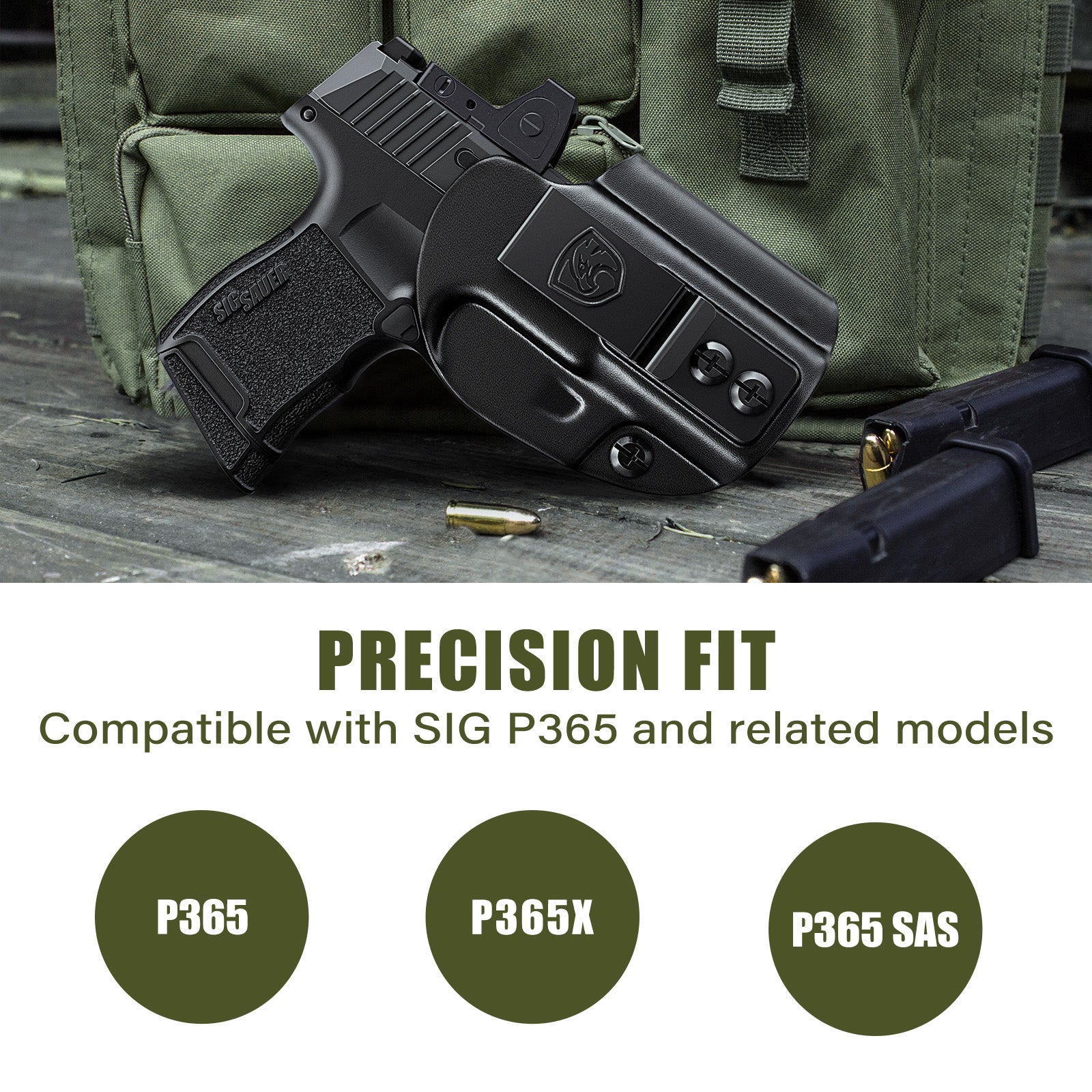 - Precision Fit: This IWB holster is designed to fit SIG Sauer P365, P365X, and P365 SAS, providing a secure, snug fit. Note: Also fits P365XL, but the barrel will extend approximately 0.6 inch beyond the holster. Not compatible with models equipped with flashlights