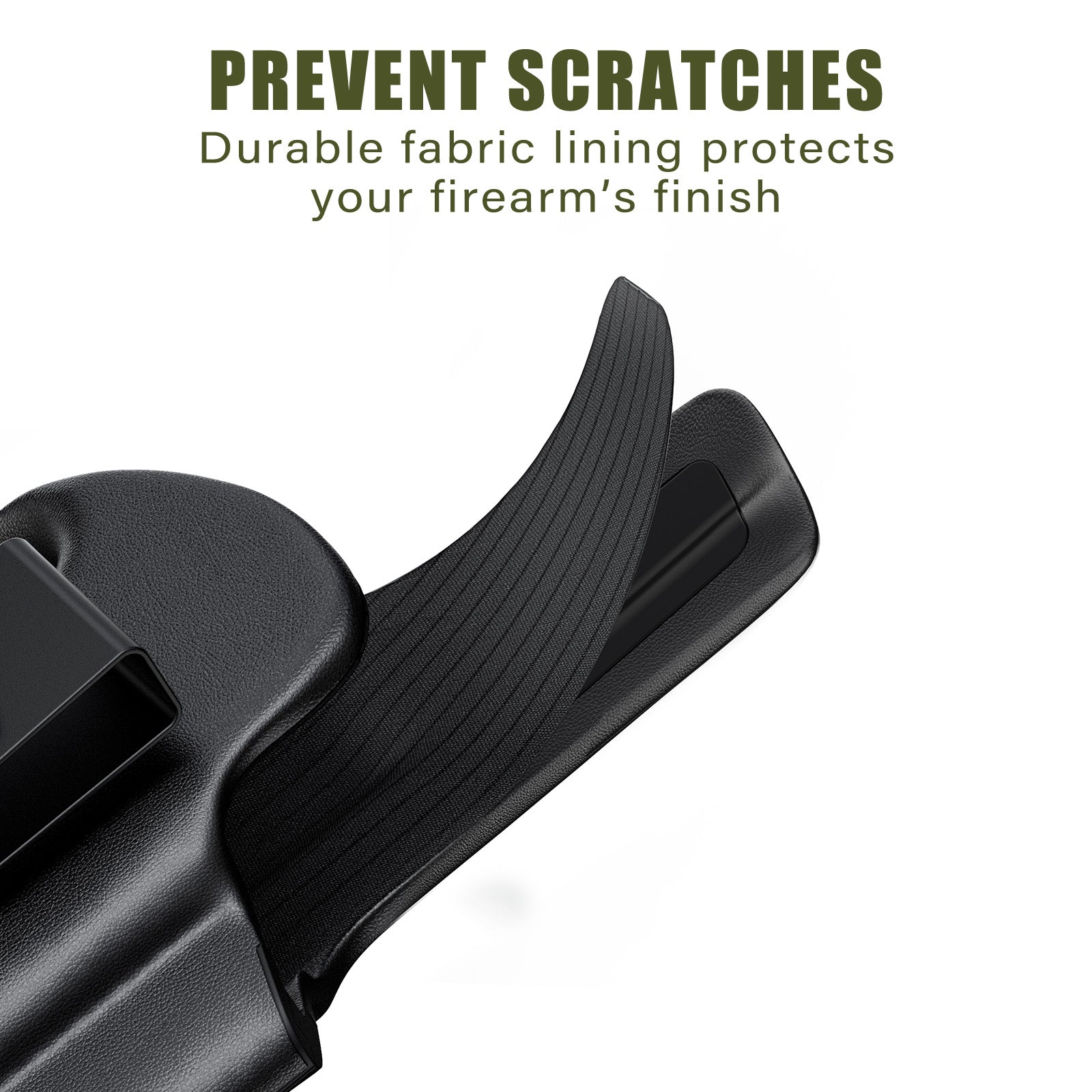 - Prevent Scratches: With wear-resistant fabric lining inside the polymer shell, this P365 holster protects your firearm’s finish and keeps it pristine for years